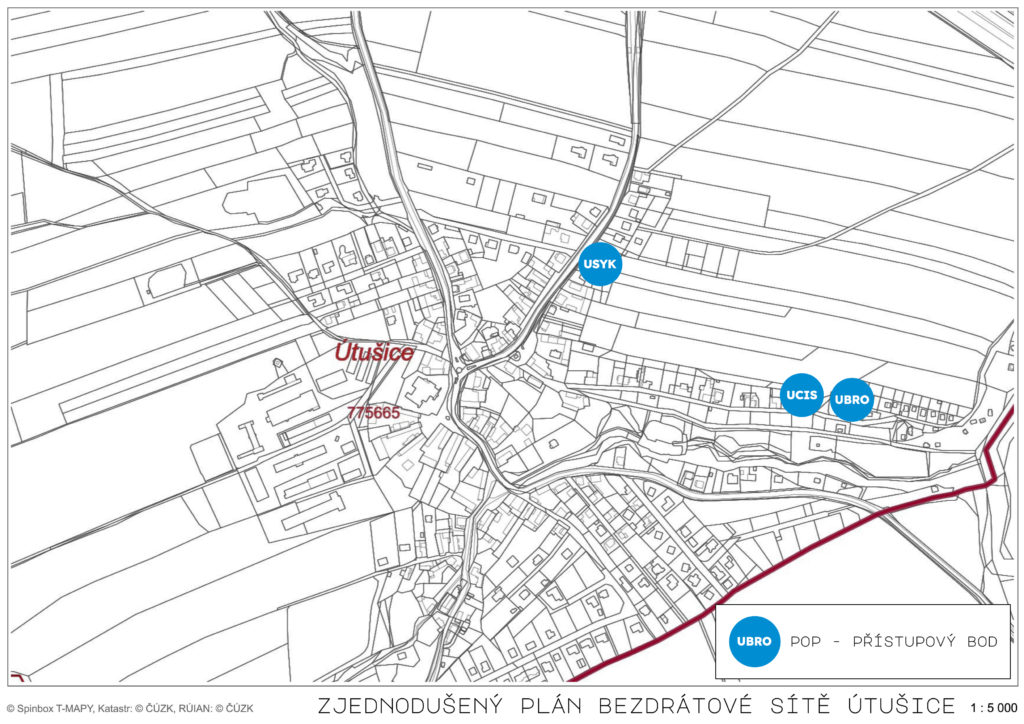 Na přístupovém bodě v Útušicích je zajištěno zálohované napájení pro případné výpadky proudu ze strany ČEZ. Výdrž zálohy je projektována na 5-6 hodin. Přívodní spoj pro celou lokalitu Útušice tvoří spoj Alcoma 17GHz s garantovanou kapacitou 300/300 Mbps. Odezvy do internetu jsou v rozmezí 5-10ms do internetu a internet je tak vhodný i pro aplikace vyžadující rychlou odezvu, stabilitu nebo například hraní online počítačových her.